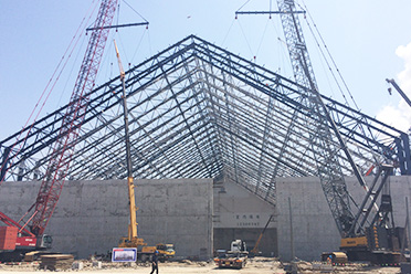 寧波臺(tái)塑電廠室內(nèi)煤場(chǎng)鋼桁架屋架工程跨度為81.2米,長(zhǎng)度為135米。
