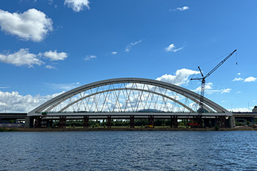 哈薩克斯坦阿斯塔納市輕軌一期伊希姆河鋼拱橋項(xiàng)目該拱橋位于哈薩克斯坦總統(tǒng)府旁,橋長(zhǎng)155m,為下承式簡(jiǎn)支系桿拱,主拱矢高2m,拱肋和主梁均采用鋼結(jié)構(gòu),拱肋采用鋼箱拱,主梁為鋼結(jié)構(gòu)縱橫梁體系。